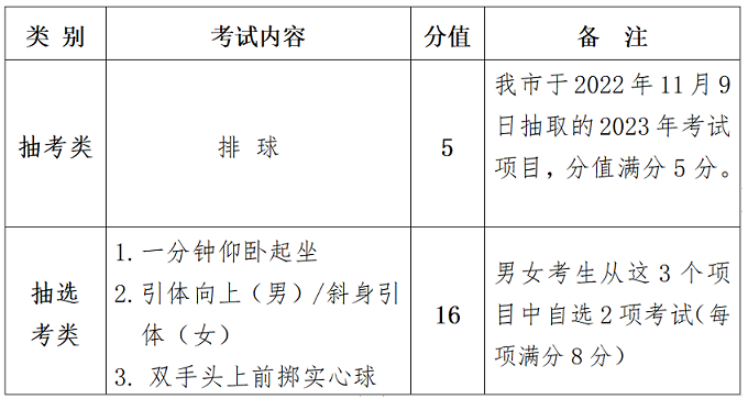 根據(jù)《教育部辦公廳關(guān)于做好當(dāng)前疫情形勢下學(xué)校體育工作的通知》(教體藝廳函〔2023〕4號)精神,為更加安全有序開展今年體育中考測試工作,經(jīng)綜合研判,取消2023年龍巖市初中畢業(yè)升學(xué)體育與健康考試(身體素質(zhì)與運動技能測試)中必考類1000米跑(男)/800米跑(女)、200米游泳(泳姿不限)項目測試,相應(yīng)成績按滿分15分計入學(xué)生體育中考成績。抽考類和抽選考類項目按原公布項目進(jìn)行。調(diào)整后的測試項目見下表:
