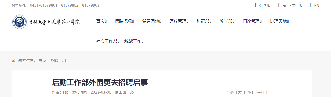 2023吉林大學(xué)白求恩第一醫(yī)院后勤工作部外圍更夫招聘2人,報(bào)名截止時(shí)間:2023年03月10日上午11:00,現(xiàn)將招聘公告原文發(fā)布如下: