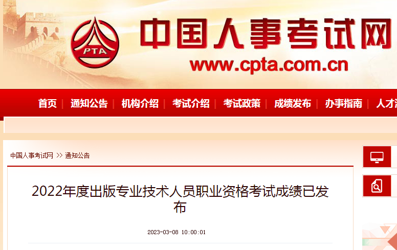 從中國人事考試網(wǎng)發(fā)布的《2022年出版專業(yè)技術人員職業(yè)資格考試成績已發(fā)布通知》得知,2022年內(nèi)蒙古出版專業(yè)技術資格考試成績查詢時間、步驟及入口已公布,2023年3月8日起查分,具體詳情如下: