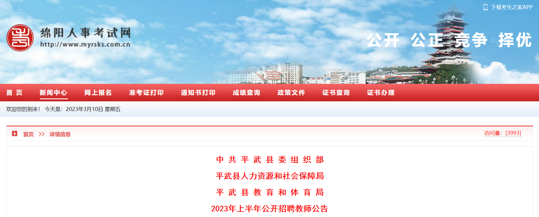 點(diǎn)擊進(jìn)入:2023年上半年四川綿陽平武縣公開招聘教師報名入口