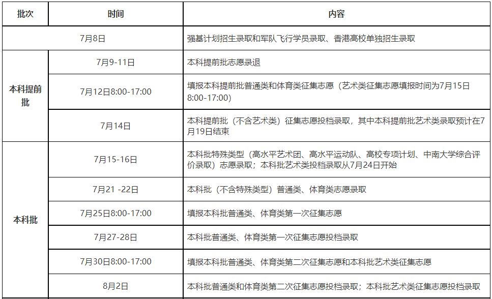 本科批:除本科提前批以外的其他本科院校(專業(yè)),包括普通類非定向計劃、普通類定向計劃、國家專項計劃(公費師范生和部分提前批招生院校的國家專項計劃安排在本科提前批)、地方專項計劃、民族班計劃、預科班計劃以及高水平藝術團、高水平運動隊、高校專項計劃、中南大學綜合評價錄取計劃、楚怡工匠計劃等招生院校(專業(yè))、職高對口招生本科專業(yè)(對口招生的省內公費師范生、優(yōu)師專項安排在本科提前批)。其中,高水平藝術團、高水平運動隊、中南大學綜合評價錄取、高校專項計劃招生錄取時間為7月15日-16日,其他本科批計劃錄取時間為7月17日至8月2日。藝術類院校(專業(yè))錄取時間為7月20日至8月2日。