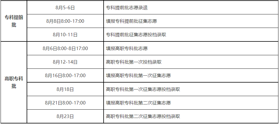 專科提前批:定向培養(yǎng)軍士、公安、司法、航海、需面試的乘務類以及我省的農技特崗生、水利特崗生、林業(yè)特崗生、基層醫(yī)療衛(wèi)生機構本土化專科層次人才培養(yǎng)招生和其他有簽約要求的高職??茖哟握猩盒#▽I(yè))。錄取時間為8月3日至11日。