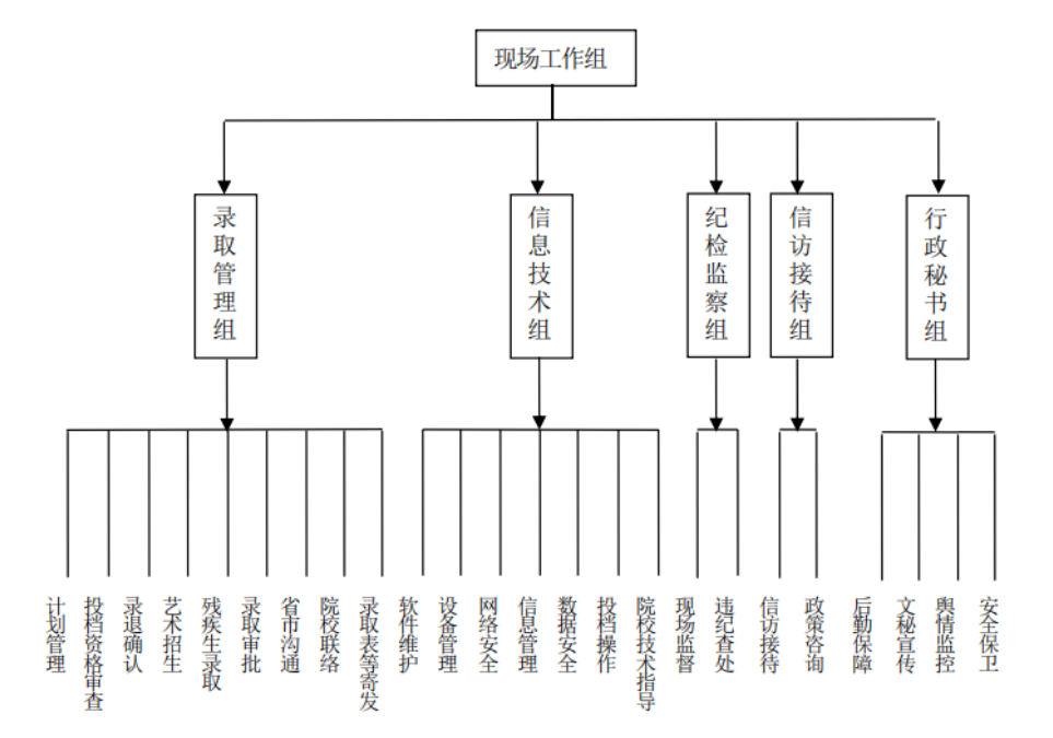 2.錄取現(xiàn)場指導監(jiān)督小組及職責。在錄取工作領導小組的領導下,主要負責協(xié)調、督促錄取現(xiàn)場各部門、各環(huán)節(jié)工作的正常運轉,全程跟蹤、監(jiān)控每一個流程的工作;負責工作運轉中重大事項的決定和異常情況的處理,研究處理錄取過程中出現(xiàn)的緊急情況。