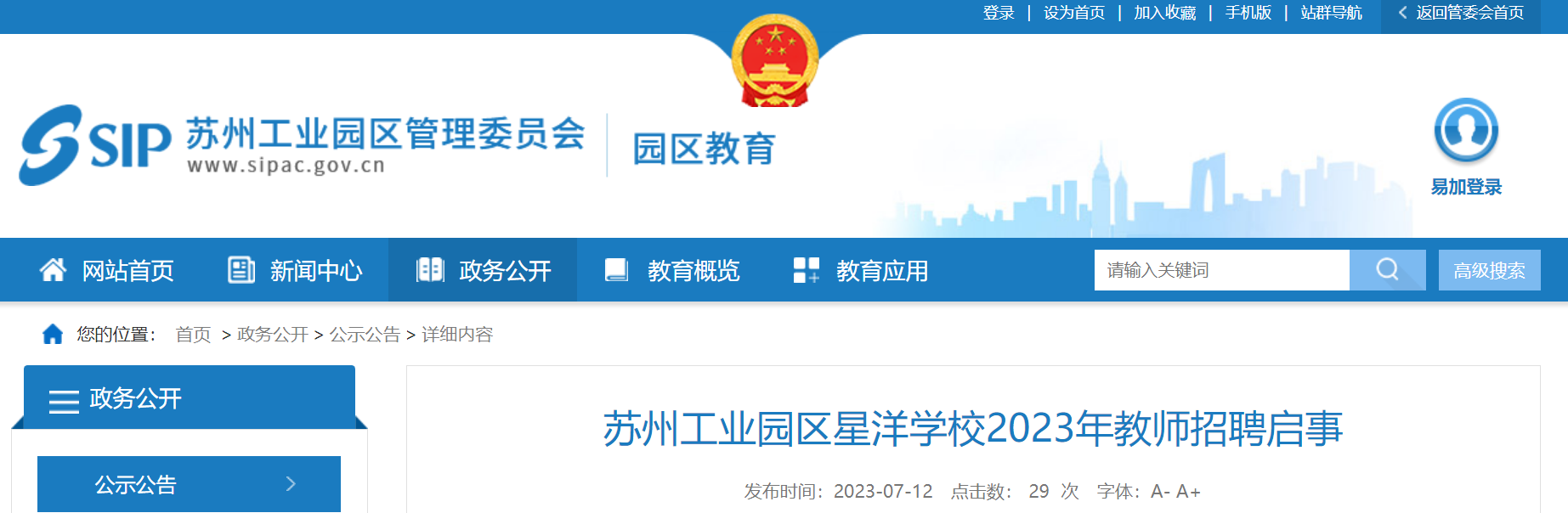 2023年江蘇蘇州工業(yè)園區(qū)星洋學(xué)校教師招聘啟事已發(fā)布,每個考生限報1所學(xué)校1個專業(yè)?,F(xiàn)將招聘公告原文發(fā)布如下: