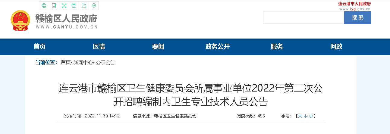 2022江蘇連云港市贛榆區(qū)衛(wèi)生健康委員會所屬事業(yè)單位第二次招聘編制內(nèi)衛(wèi)生專業(yè)技術(shù)人員48人,報名時間:2022年12月1日09:00—12月14日16:00,現(xiàn)將招聘公告原文發(fā)布如下: