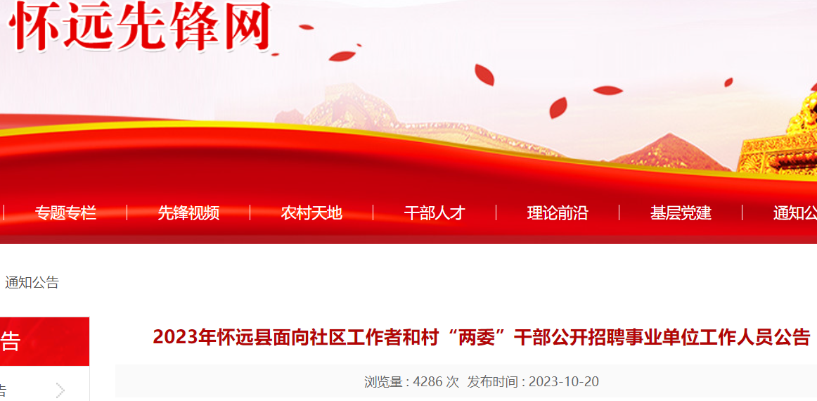 小編根據(jù)懷遠先鋒網(wǎng)發(fā)布“2023年懷遠縣面向社區(qū)工作者和村“兩委”干部公開招聘事業(yè)單位工作人員公告”得知,2023安徽蚌埠懷遠縣面向社區(qū)工作者和村“兩委”干部公開招聘事業(yè)單位工作人員5人,報名時間為10月27日至11月2日。