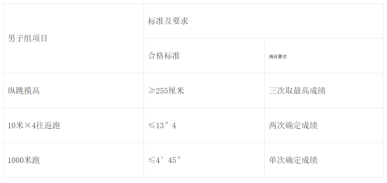 體能測(cè)評(píng)實(shí)施規(guī)則參照《公安機(jī)關(guān)錄用人民警察體能測(cè)評(píng)實(shí)施規(guī)則》(附件2)。體能測(cè)評(píng)項(xiàng)目及合格標(biāo)準(zhǔn)如下:
