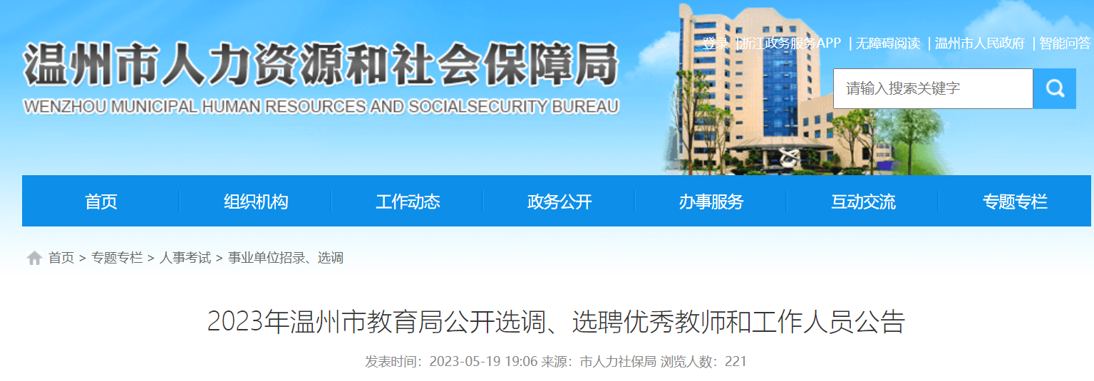 2023浙江溫州市教育局選調(diào)、選聘優(yōu)秀教師和工作人員20人,報(bào)名時(shí)間:2023年5月29—30日?,F(xiàn)將招聘公告原文發(fā)布如下: