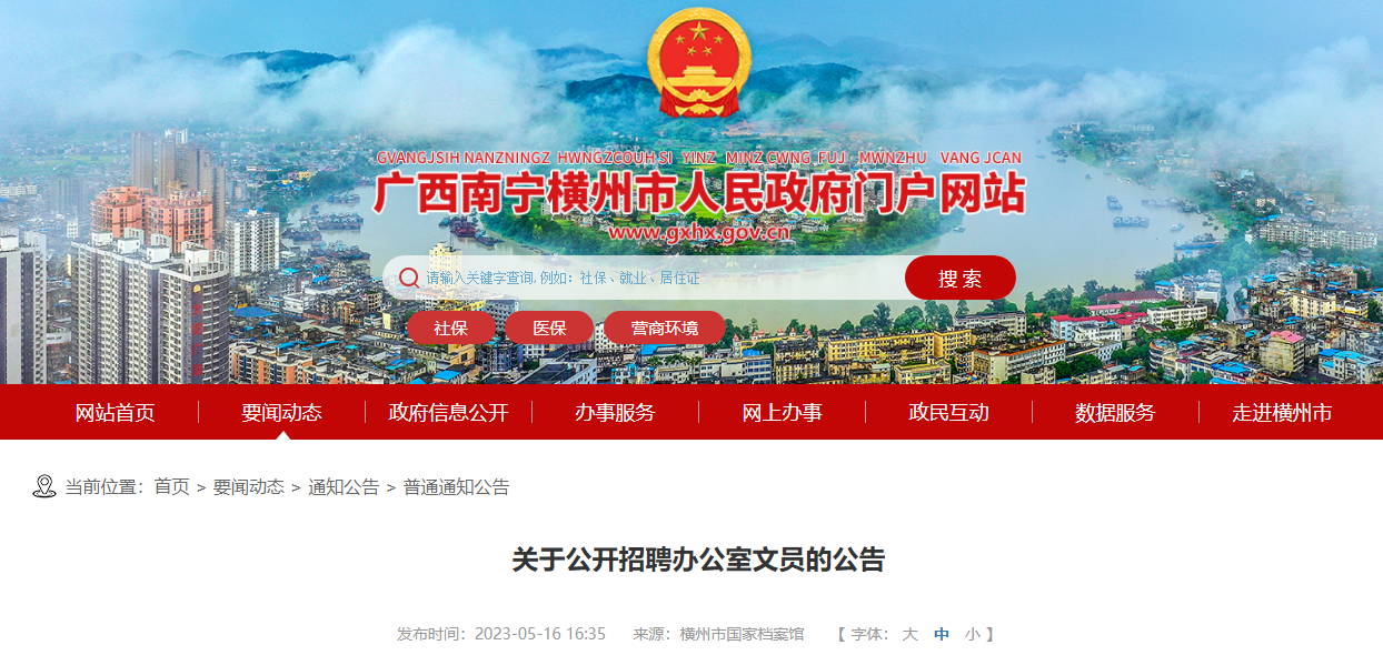 2023年廣西南寧市橫州市國家檔案館招聘辦公室文員1人。報名時間2023年5月17日—5月25日?,F(xiàn)將公告原文發(fā)布如下: