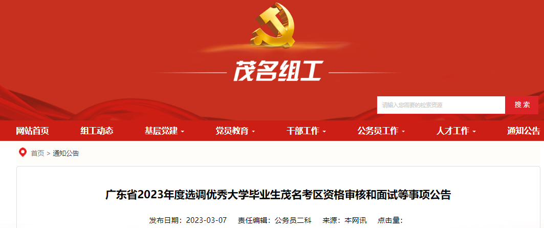 2023年廣東省選調優(yōu)秀大學畢業(yè)生茂名考區(qū)資格審核和面試等事項公告已公布,為了方便廣大考生的查閱,下面為您詳細介紹一下本次選調生資格審核和面試的具體事宜,希望廣大考生及時關注,如有相關疑問,請關注為您實時做出的更新。