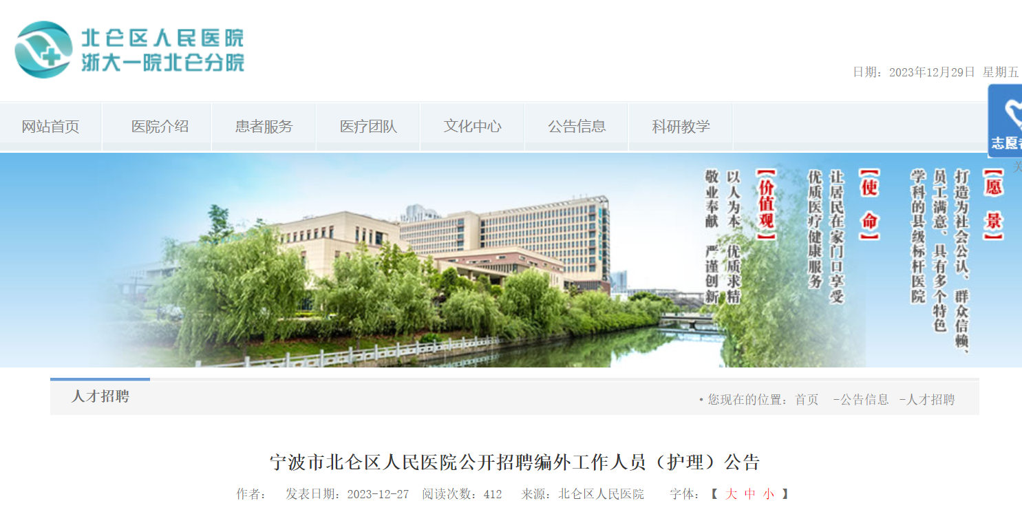 2023年浙江寧波市北侖區(qū)人民醫(yī)院公開(kāi)招聘編外工作人員(護(hù)理)20人,報(bào)名起止時(shí)間:2024年1月9日至2024年1月10日(上午8:00-11:30,下午13:00-16:30)?,F(xiàn)將招聘公告原文發(fā)布如下: