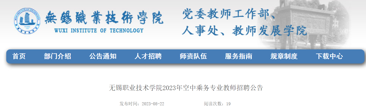 2023江蘇無錫職業(yè)技術學院招聘空中乘務專業(yè)教師1人,網上報名時間:自公告之日起至8月28日下午17:00止?,F(xiàn)將招聘公告原文發(fā)布如下: