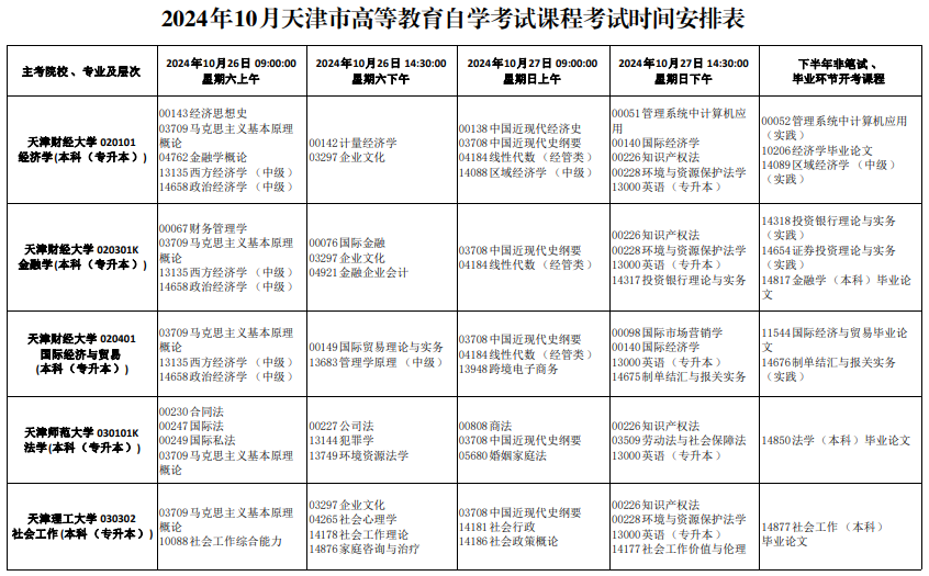 點擊查看:2024年10月天津市高等教育自學考試課程考試時間安排表