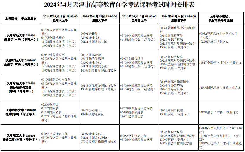 自學(xué)考試頻道根據(jù)天津招考資訊網(wǎng)公布的《2024年天津市高等教育自學(xué)考試課程考試時(shí)間安排及課程使用教材的通知》了解到,2024年4月天津東麗自學(xué)考試時(shí)間已公布,安排在2024年4月13日-14日期間。具體如下: