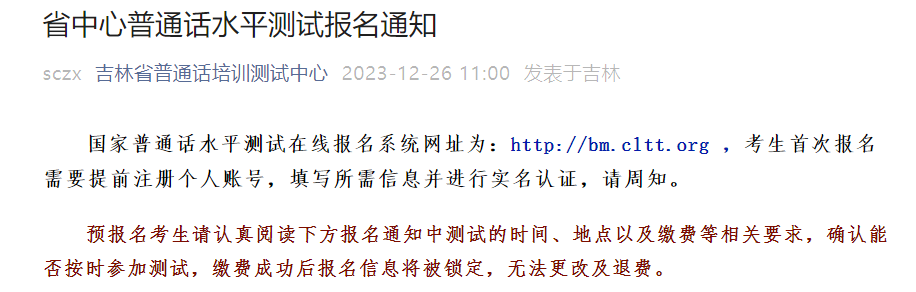 從吉林省普通話培訓(xùn)測試中心獲悉,吉林省普通話培訓(xùn)測試中心2024年1月普通話考試時(shí)間及報(bào)名安排已公布,1月6日、7日舉行考試,具體詳情如下: