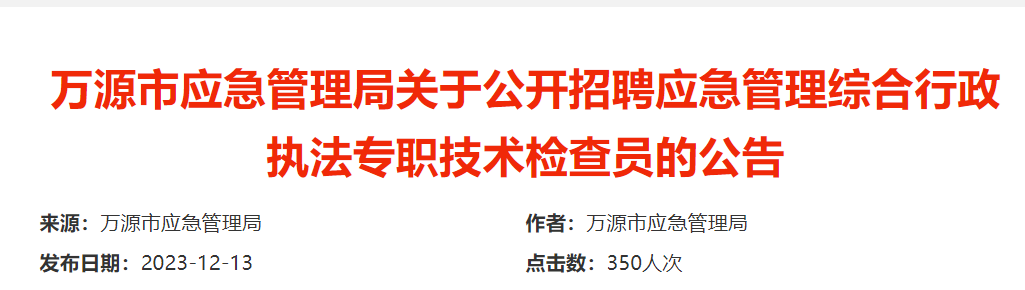 根據(jù)《四川省應(yīng)急管理綜合行政執(zhí)法技術(shù)檢查員和社會(huì)監(jiān)督員工作實(shí)施細(xì)則》規(guī)定及工作需要,按照“公開、平等、競爭、擇優(yōu)”原則,萬源市應(yīng)急管理局決定面向社會(huì)公開招聘應(yīng)急管理綜合行政執(zhí)法專職技術(shù)檢查員,現(xiàn)將有關(guān)事項(xiàng)公告如下: