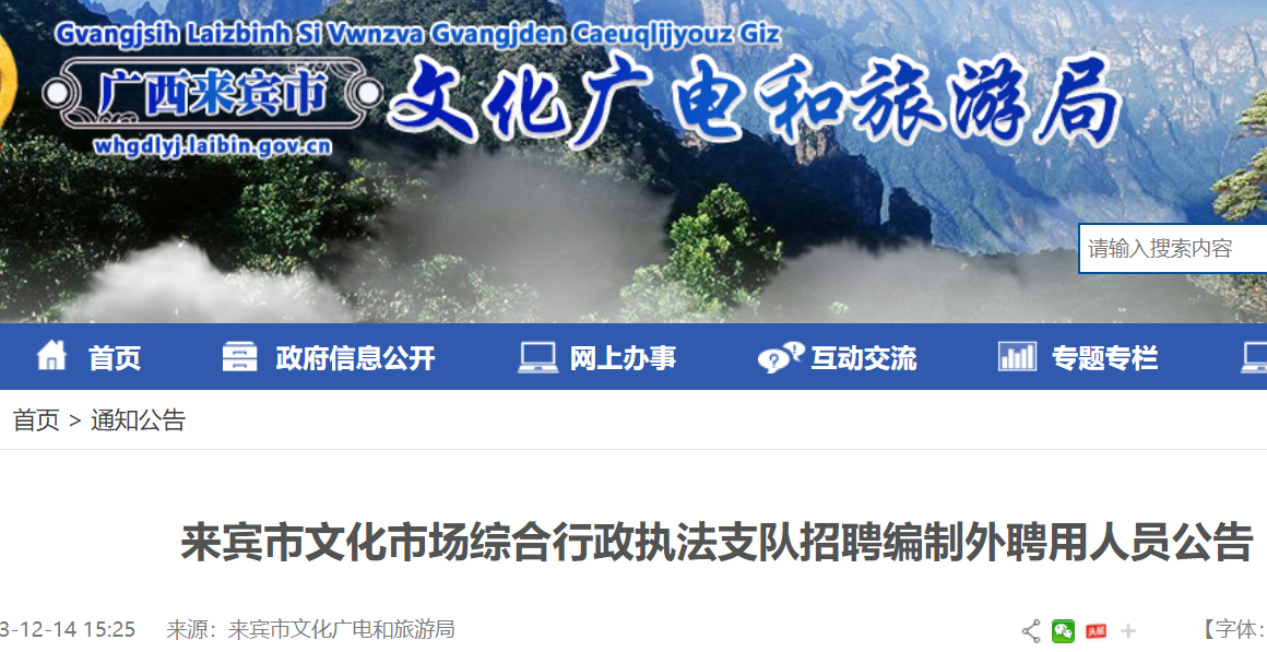 因工作需要,來(lái)賓市文化市場(chǎng)綜合行政執(zhí)法支隊(duì)擬面向社會(huì)公開(kāi)招聘編制外工作人員1名?,F(xiàn)將有關(guān)事項(xiàng)公告如下: