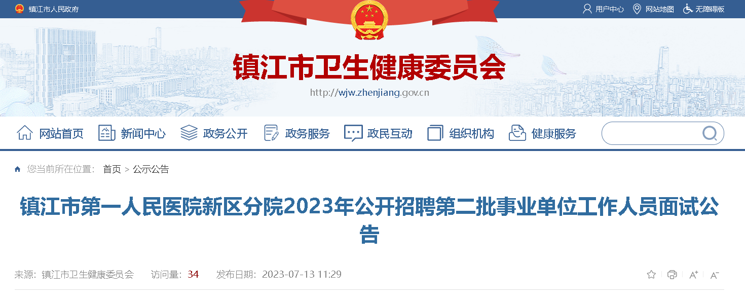 2023江蘇鎮(zhèn)江市第一人民醫(yī)院新區(qū)分院招聘第二批事業(yè)單位工作人員面試時間已公布,面試時間:2023年7月20日中午13時,現(xiàn)將招聘公告原文發(fā)布如下:
