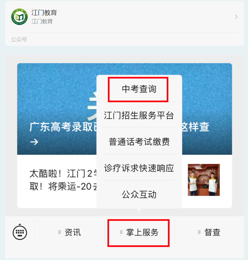 關(guān)注“江門教育”微信公眾號,點擊頁面底部“中考查詢”,輸入“考生號”和“證件號末6位”進(jìn)行查詢。