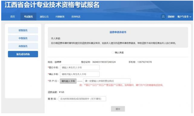 在辦理退費(fèi)申請(qǐng)時(shí)填寫和提交的退款資料真實(shí)有效,如因本人提交的退費(fèi)申請(qǐng)信息錯(cuò)誤,導(dǎo)致退款不成功等后果由本人自行承擔(dān)。