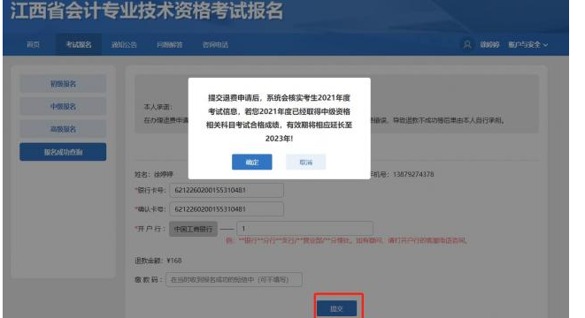 在提交退費(fèi)申請(qǐng)成功后,系統(tǒng)會(huì)核實(shí)考生2021年度考試信息,并將考生2021年度已經(jīng)取得的中級(jí)資格相關(guān)科目考試合格成績(jī)有效期相應(yīng)延長(zhǎng)至2023年。
