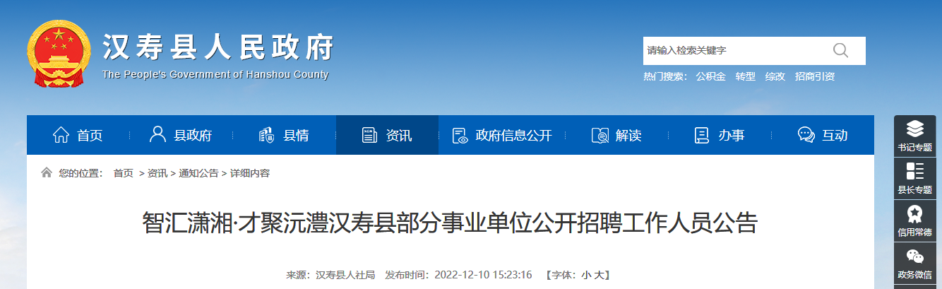 2022年12月10日至12月18日,在漢壽縣人民政府公開發(fā)布招聘信息。