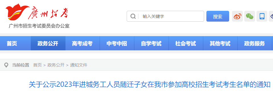 根據(jù)省教育廳等六部門《關(guān)于做好進(jìn)城務(wù)工人員隨遷子女在廣東省參加高考有關(guān)工作的通知》(粵教考函〔2017〕41號)規(guī)定,現(xiàn)將我市通過審核且已參加2023年高考報名的進(jìn)城務(wù)工人員隨遷子女名單(見附件)發(fā)給你們,請盡快在區(qū)教育局的相關(guān)網(wǎng)站和有關(guān)中學(xué)進(jìn)行公示。同時,我辦從3月15日起將在廣州招考網(wǎng)(網(wǎng)址:http://gzzk.gz.gov.cn/)予以公示。