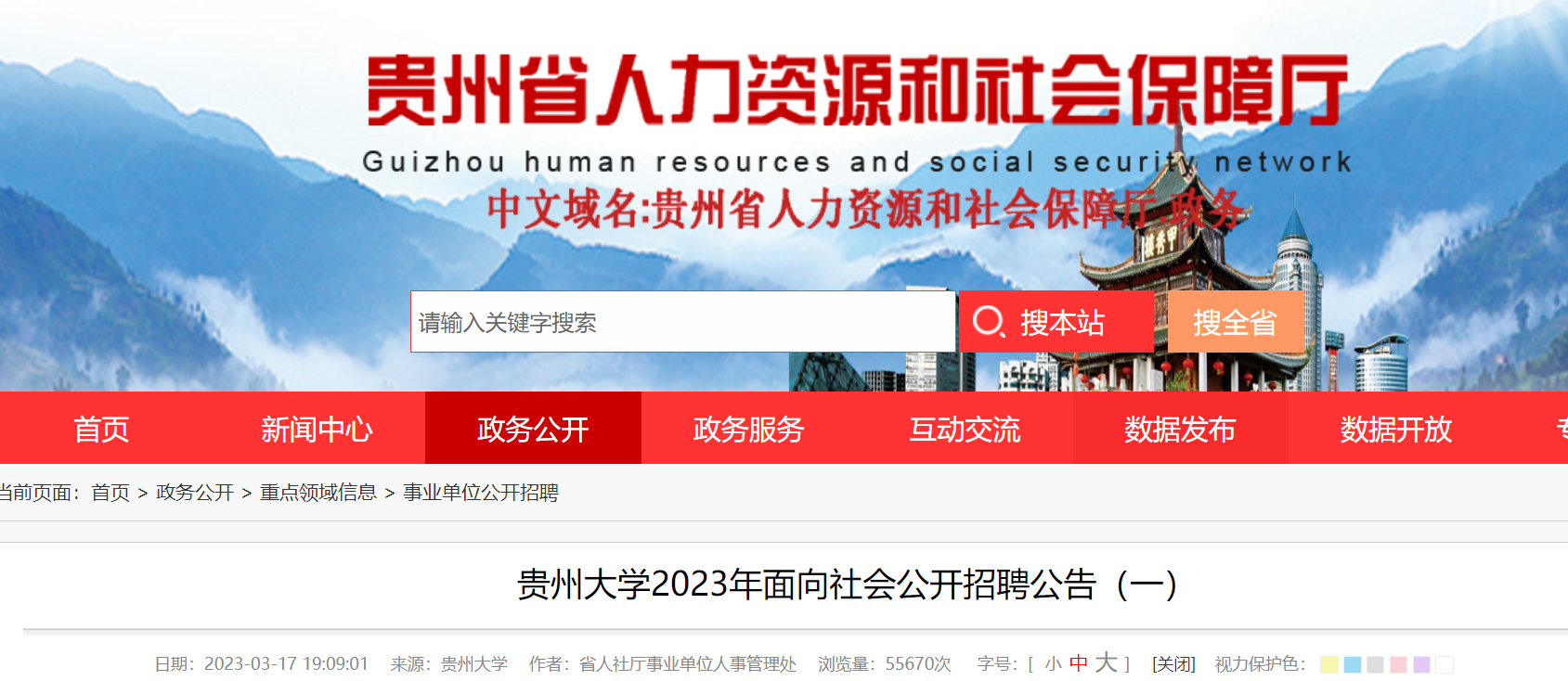 在貴州人力資源社會(huì)保障網(wǎng)(http://rst.guizhou.gov.cn)和貴州大學(xué)(http://www.gzu.edu.cn/)發(fā)布公開(kāi)招聘公告。公告時(shí)間從2023年3月17日到2023年3月27日。