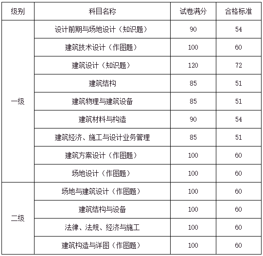 2022年注冊(cè)建筑師考試合格標(biāo)準(zhǔn)為試卷滿分的60%,各科合格分?jǐn)?shù)如下: