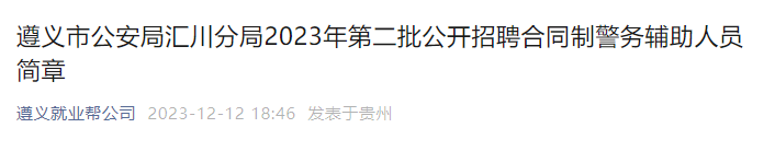 從遵義就業(yè)幫公司了解到,2023年第二批貴州遵義市公安局匯川分局招聘合同制警務(wù)輔助人員50人,相關(guān)事宜詳情如下: