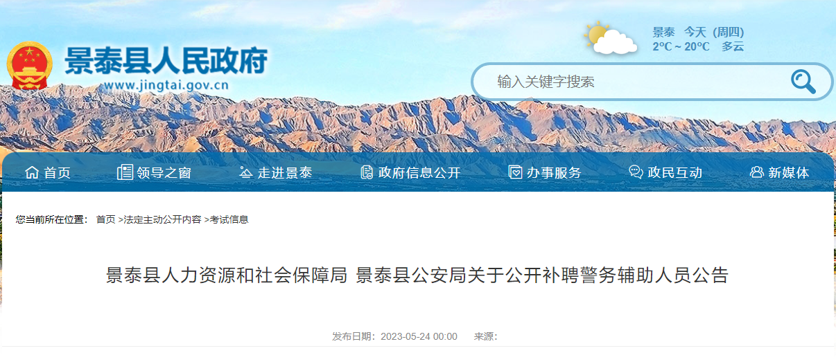 從景泰縣人民政府了解到,2023年甘肅白銀景泰縣公安局補聘警務(wù)輔助人員20人,相關(guān)事宜如下: