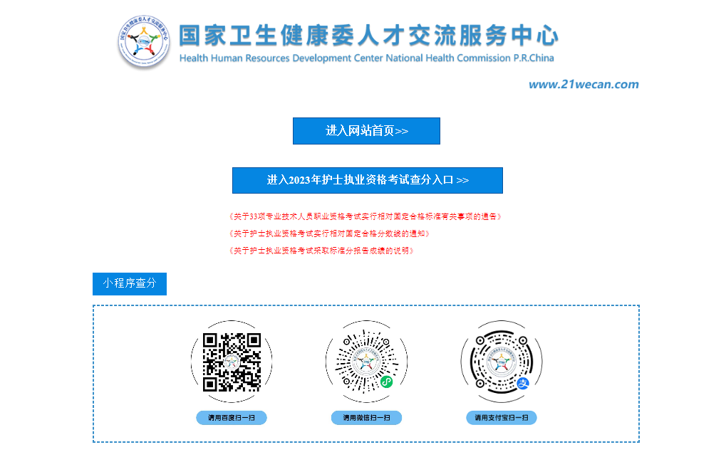 登錄國家衛(wèi)生健康委人才交流服務(wù)中心網(wǎng)站,點擊“進(jìn)入2023年護(hù)士執(zhí)業(yè)資格考試查分入口”。