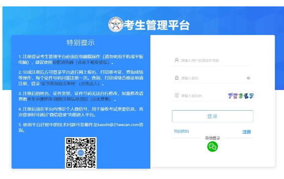 使用報名時注冊的用戶名、密碼,登錄考生管理平臺;也可通過“微信登錄”功能,使用綁定的微信號掃碼登錄考生管理平臺。