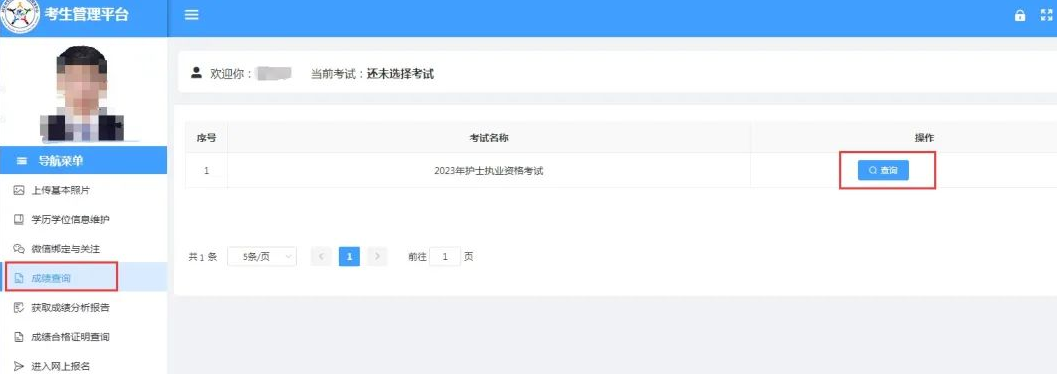 先點擊左側(cè)導(dǎo)航菜單中的“成績查詢”功能,再點擊2023年護(hù)士執(zhí)業(yè)資格考試項目右側(cè)的“查詢”按鈕即可顯示查詢結(jié)果。