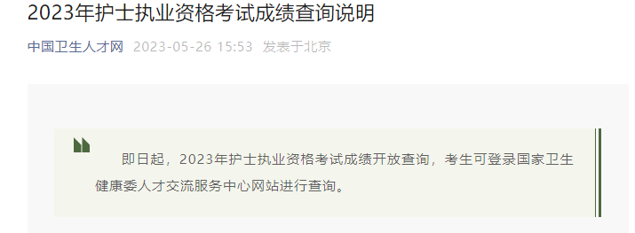 從中國衛(wèi)生人才網(wǎng)發(fā)布的《2023年護(hù)士執(zhí)業(yè)資格考試成績查詢說明》得知,2023年吉林護(hù)士資格證成績查詢時間、方式及入口已公布,5月26日起查分,具體詳情如下:
