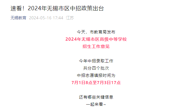 從無錫教育局獲悉,2024年江蘇無錫市區(qū)中招政策公布!具體詳情如下: