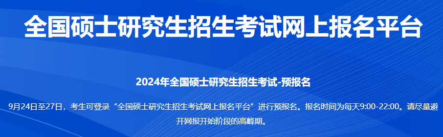 考研頻道根據(jù)四川省教育考試院公布的《四川2024年碩士研究生招生考試網(wǎng)上報(bào)名公告》了解到,2024年四川研究生考試預(yù)報(bào)名入口于9月24日開(kāi)通,考生可點(diǎn)擊以下鏈接進(jìn)入研招網(wǎng)進(jìn)行預(yù)報(bào)名。具體如下: