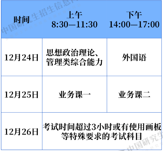 每科考試時(shí)間一般為3小時(shí);建筑設(shè)計(jì)等安排在12月26日考試的特殊科目考試時(shí)間長(zhǎng)不超過6小時(shí)。詳細(xì)考試時(shí)間、考試科目及有關(guān)要求等由考點(diǎn)和招生單位予以公布。