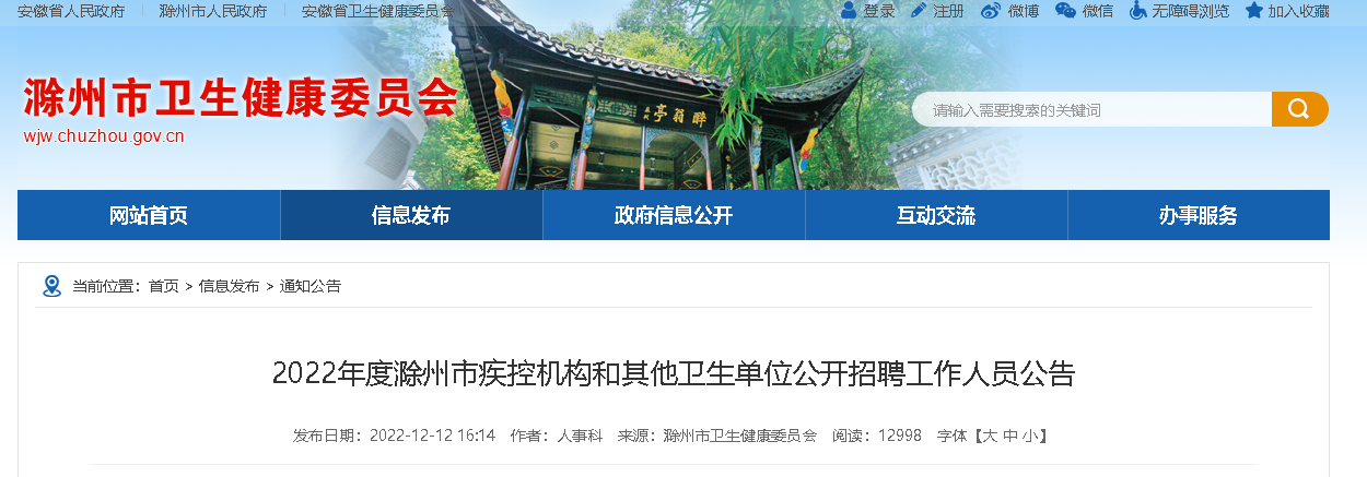 2022年度滁州市疾控機(jī)構(gòu)和其他衛(wèi)生單位公開招聘工作人員91名,招聘計劃(崗位)等信息于12月12日在滁州市衛(wèi)生健康委員會(http://wjw.chuzhou.gov.cn/)網(wǎng)站上發(fā)布。