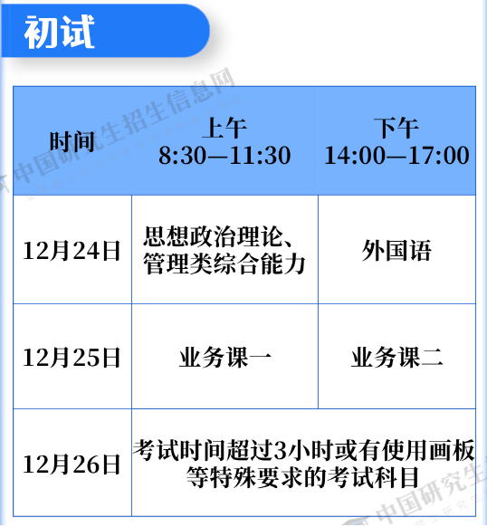 海南考研時間2023年具體考試時間是2022年12月24日至12月26日。(每天上午8:30—11:30,下午14:00—17:00)??荚嚂r間超過3小時或有使用畫板等特殊要求的考試科目在12月26日進行(起始時間8:30,截止時間由招生單位確定,不超過14:30)。