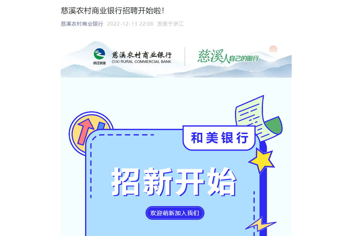 原文標(biāo)題:慈溪農(nóng)村商業(yè)銀行招聘開始啦!