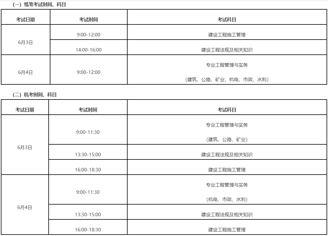 機(jī)考報(bào)考建筑工程、公路工程、礦業(yè)工程專業(yè)的考生只能在6月3日參加考試;報(bào)考市政公用工程、機(jī)電工程、水利工程專業(yè)的考生只能在6月4日參加考試。