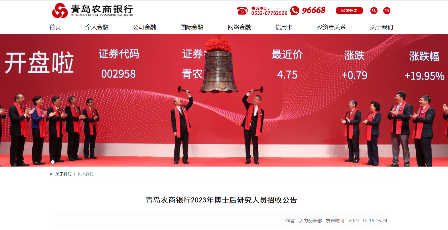 2023年山東青島農(nóng)商銀行博士后研究人員招收公告已發(fā)布,現(xiàn)將招聘公告發(fā)布如下: