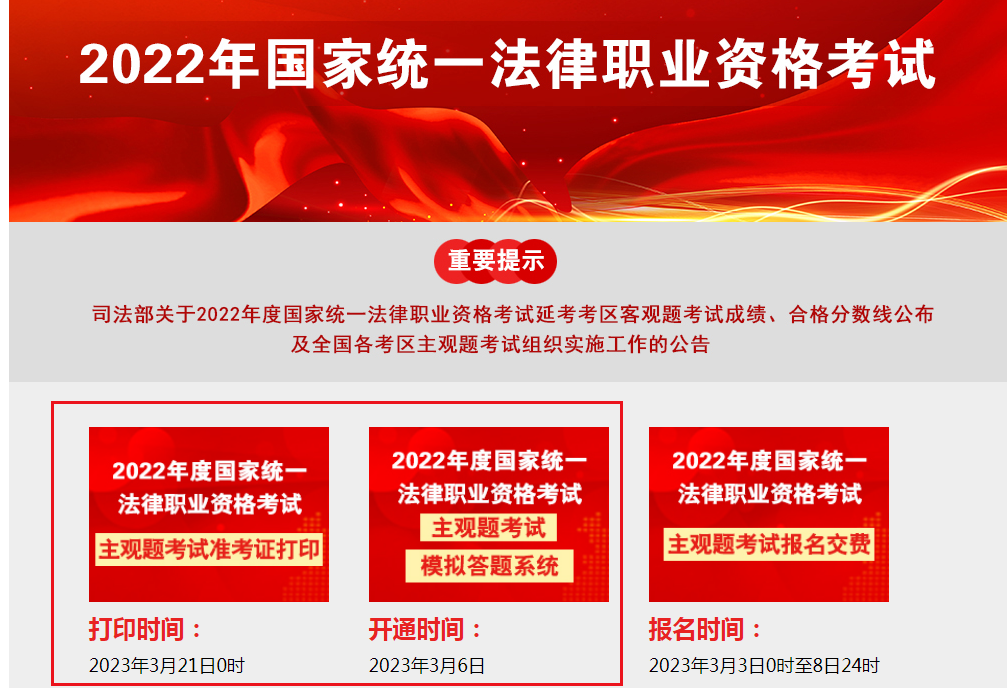 2022年國家統(tǒng)一法律職業(yè)資格主觀題考試準(zhǔn)考證打印時間為2023年3月21日0時起,報名參加主觀題考試人員,請于2023年3月21日-3月25日登錄司法部(www.moj.gov.cn)打印準(zhǔn)考證。