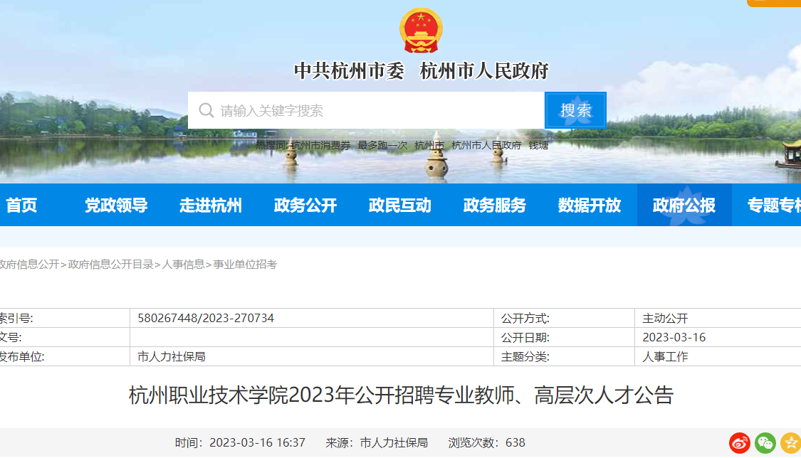 2023年浙江杭州職業(yè)技術(shù)學(xué)院公開招聘專業(yè)教師、高層次人才公告已發(fā)布,自公告發(fā)布之日起,根據(jù)各崗位報(bào)名情況,適時(shí)組織考試考核和面試,不設(shè)最低開考比例,直至相應(yīng)崗位落實(shí)聘用人員。現(xiàn)將招聘公告原文發(fā)布如下: