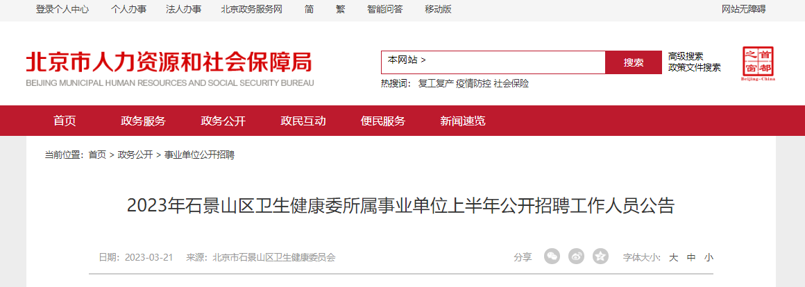 2023北京石景山區(qū)衛(wèi)生健康委所屬事業(yè)單位上半年公開招聘工作人員,報(bào)名時(shí)間:即日起至2023年3月30日16時(shí),現(xiàn)將招聘公告原文發(fā)布如下: