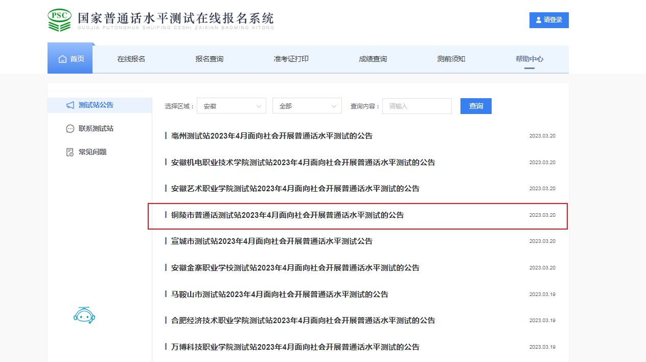 從國家普通話水平測試在線報名系統(tǒng)獲悉,2023年4月安徽銅陵普通話報名時間及考試時間已公布,報名時間3月27日起,考試時間4月15日起,具體詳情如下: