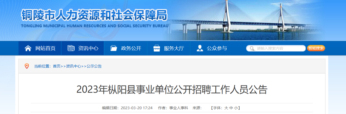 根據(jù)《事業(yè)單位人事管理?xiàng)l例》(國務(wù)院令第652號)、《關(guān)于印發(fā)〈安徽省事業(yè)單位公開招聘人員暫行辦法〉的通知》(皖人社發(fā)〔2010〕78號)等規(guī)定,現(xiàn)就2023年樅陽縣事業(yè)單位公開招聘工作人員有關(guān)事項(xiàng)公告如下: