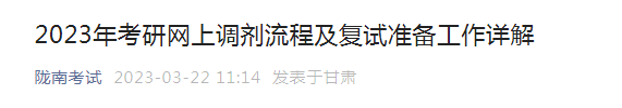 考研頻道從隴南考試了解到,2023年全國(guó)考研網(wǎng)上調(diào)劑流程及復(fù)試準(zhǔn)備工作詳解已發(fā)布,詳情如下: