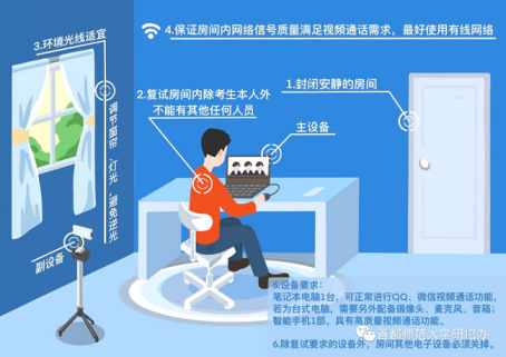 根據(jù)近兩年研考復(fù)試的具體規(guī)定,整理出以下線上復(fù)試的注意事項(xiàng),供考生參考: